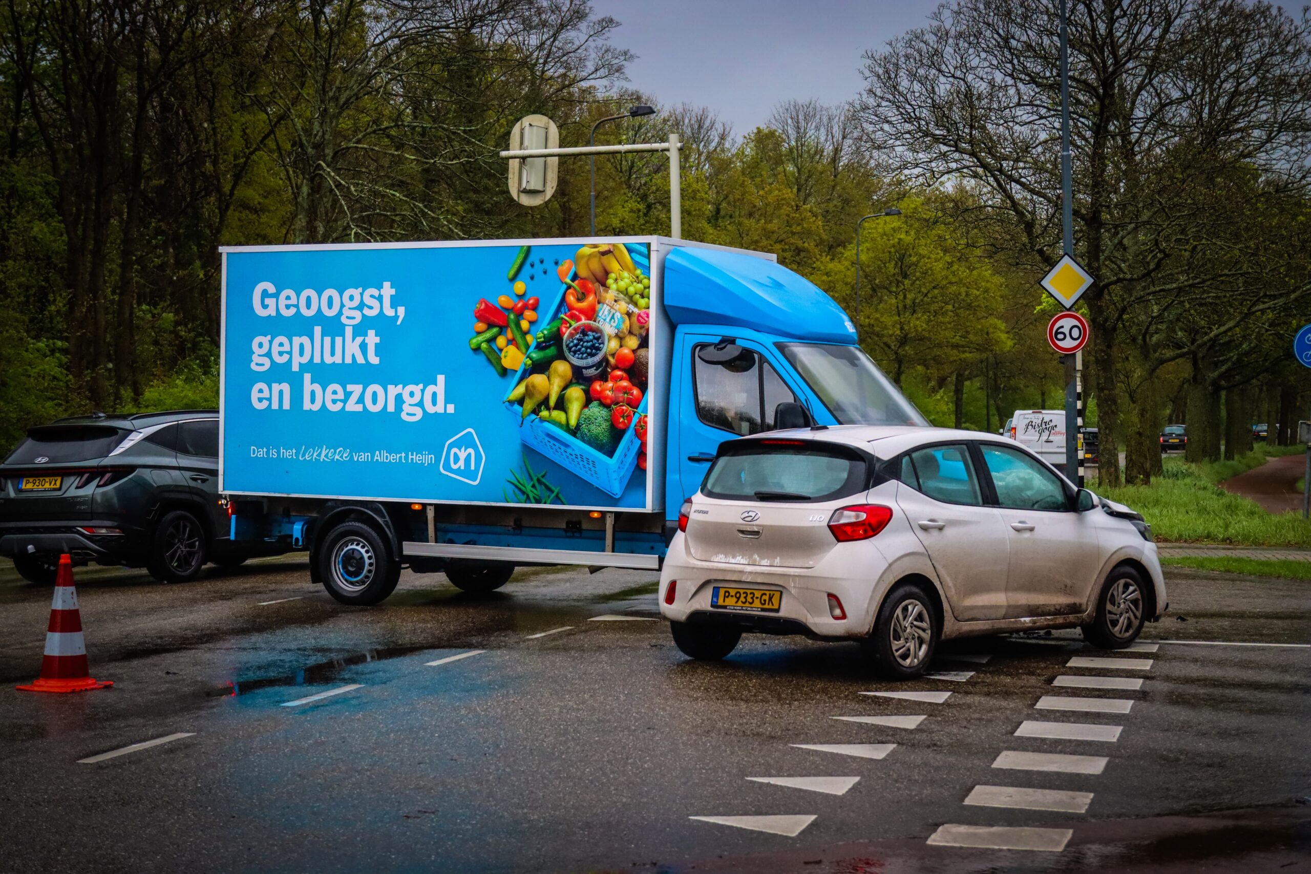 Het voertuig van de supermarkt wilde links afslaan en kwam daarbij in botsing met de auto. Niemand raakte gewond. Wel zijn beide voertuigen zodanig beschadigd dat de bergingsdienst die moet meenemen.