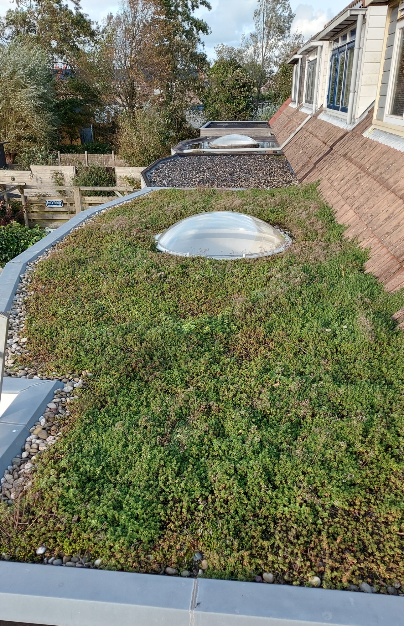 Op de PIR platen moet normaal gesproken ballast worden gelegd zoals bijvoorbeeld grind. Vincent vond het, in verband met de biodiversiteit en het milieu, leuker om er een Sedumdak op aan te leggen. Sedum bestaat uit diverse vetplanten die veel water opslaan in hun blaadjes en weinig onderhoud vragen. Voordeel is koeling in de zomer, het vasthouden van water en natuurlijk het mooie groene uiterlijk. In de winter geeft Sedum helaas geen isolatie, vandaar dat Vincent eerst de PIR-isolatieplaten heeft aangebracht.