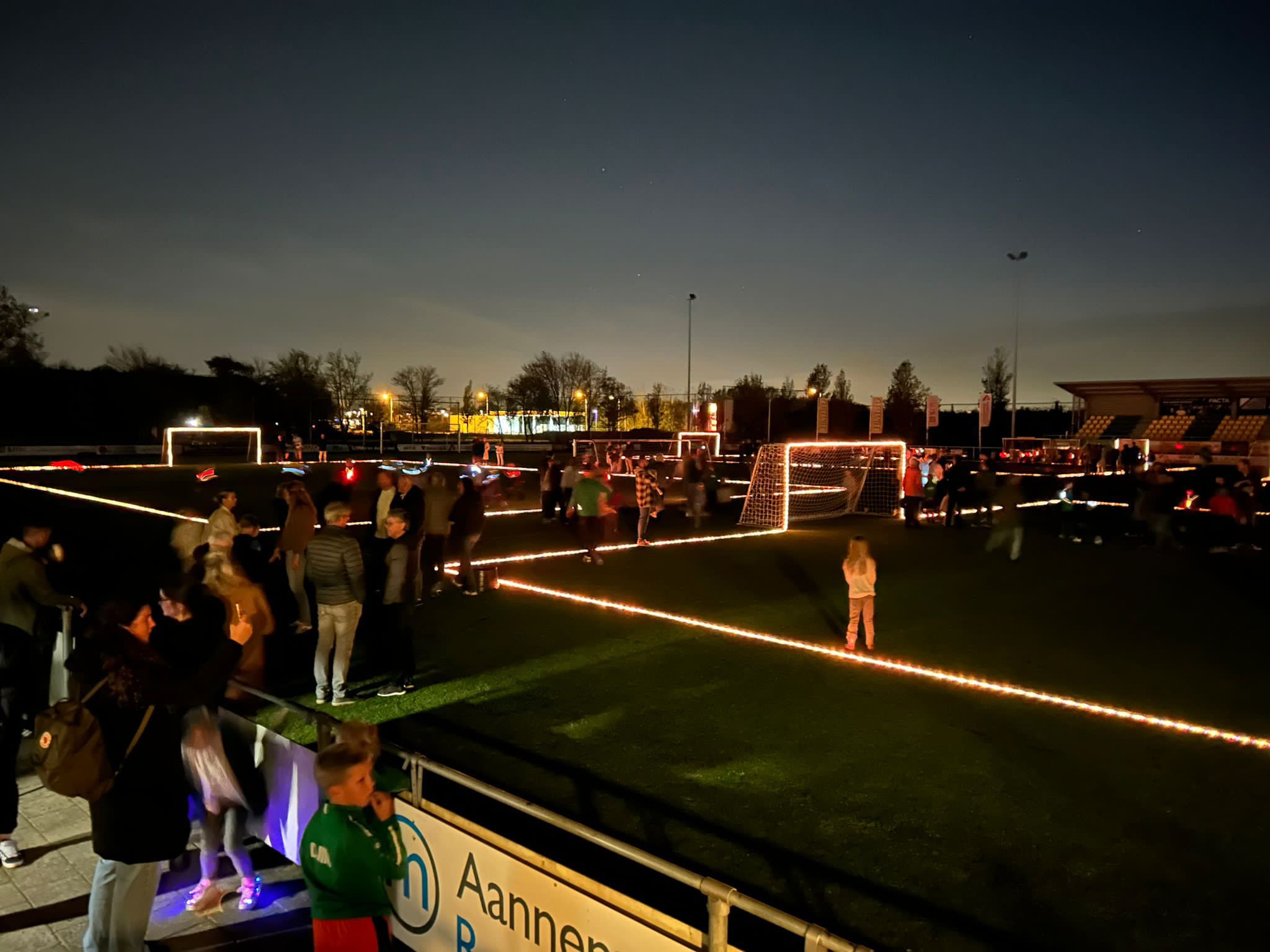 Voor wie niet precies weet wat Ledsvoetbal is, kijk vooral even op www.ledsvoetbal.nl. In het kort gezegd, is het voetballen in het donker met verlichte velden, ballen en hesjes. Superleuk om te doen!