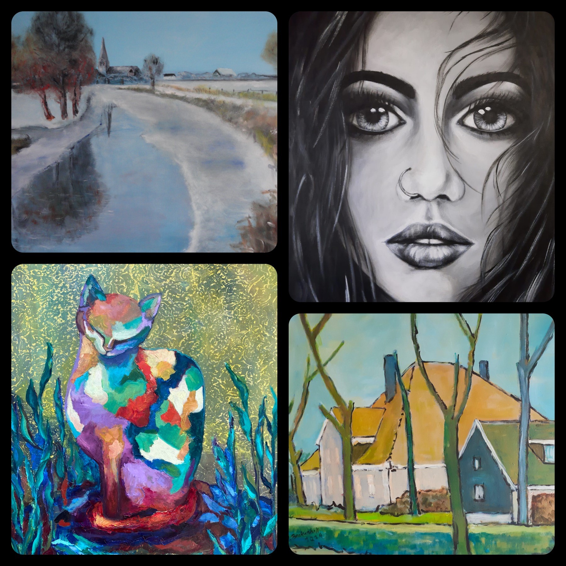 Ton Brakenhoff blijft dicht bij huis met schilderijen van Uitgeester landschappen, zowel historisch als modern, en enkele kleurrijke abstracte werken.