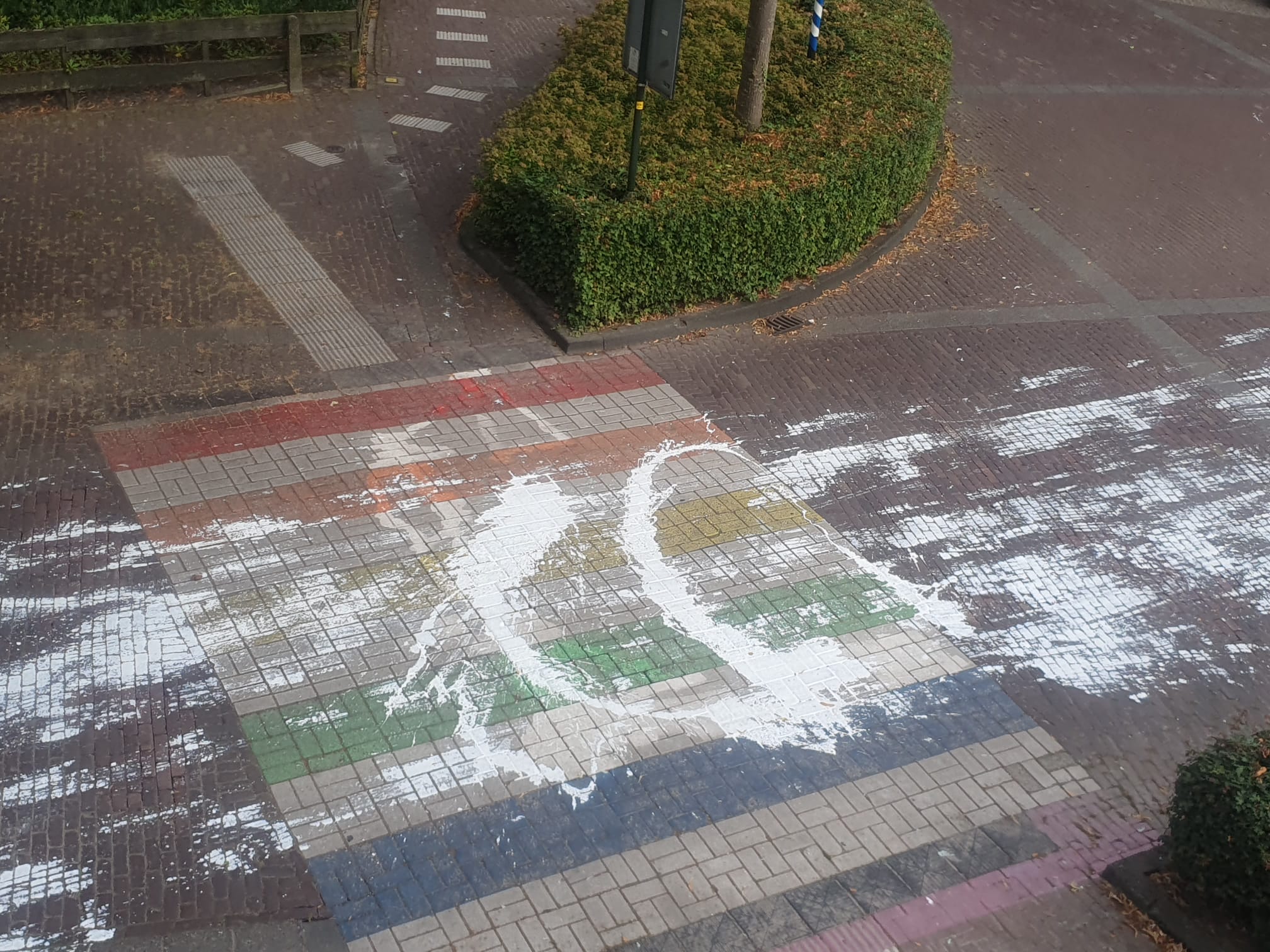 Heiloo – Zaterdagochtend is het regenboogzebrapad achter de Albert Heijn bij winkelcentrum Het Loo wederom beklad.