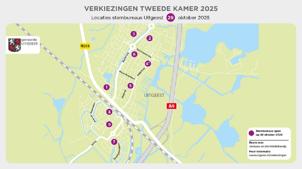 UITGEEST – De stembureaus zijn open op woensdag 29 oktober 2025 van 7.30 tot 21.00 uur. Met uitzondering van het stembureau op het station, dat is tot 20.00 uur geopend.